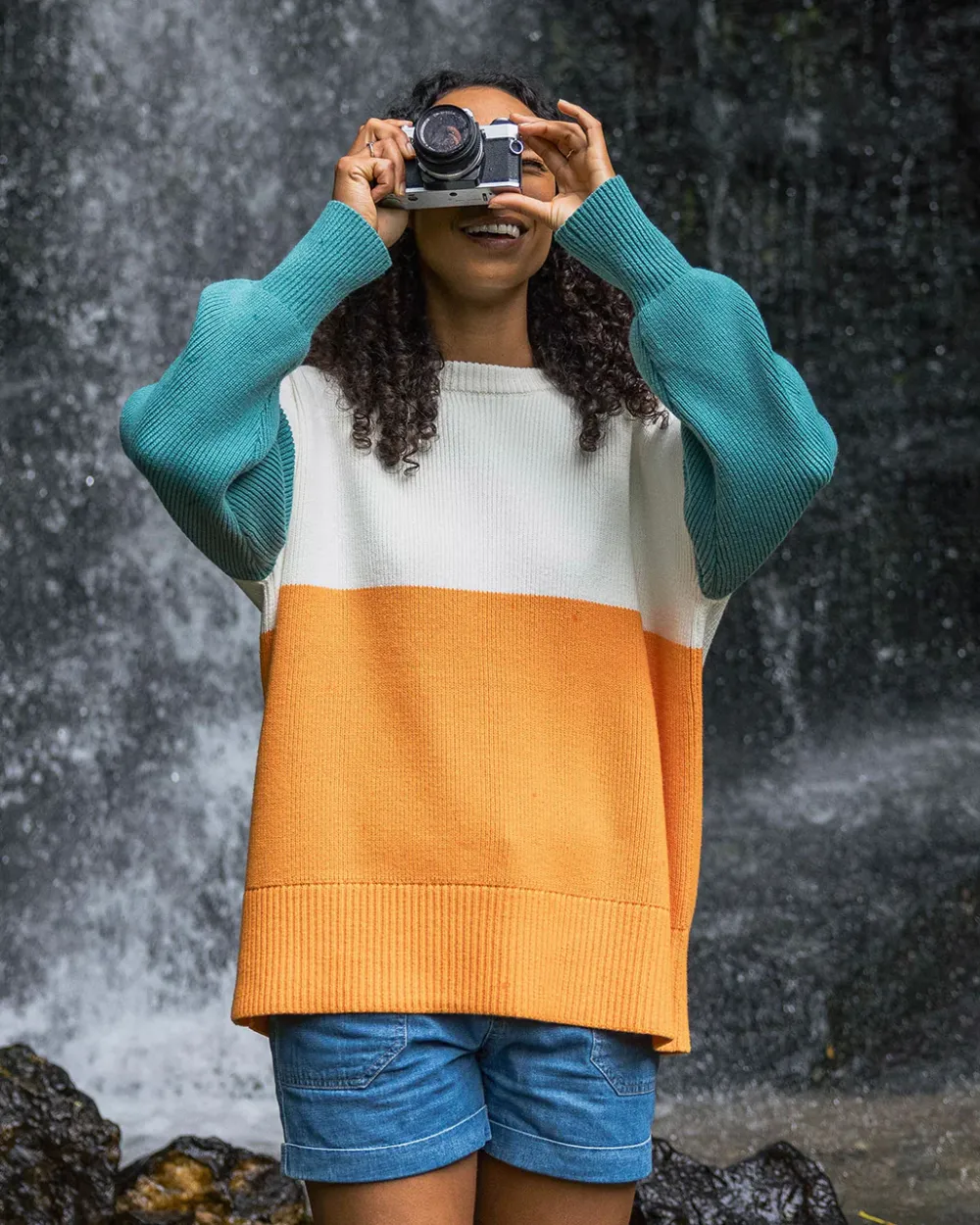 - Colour block design with different colour lower body and sleeves.